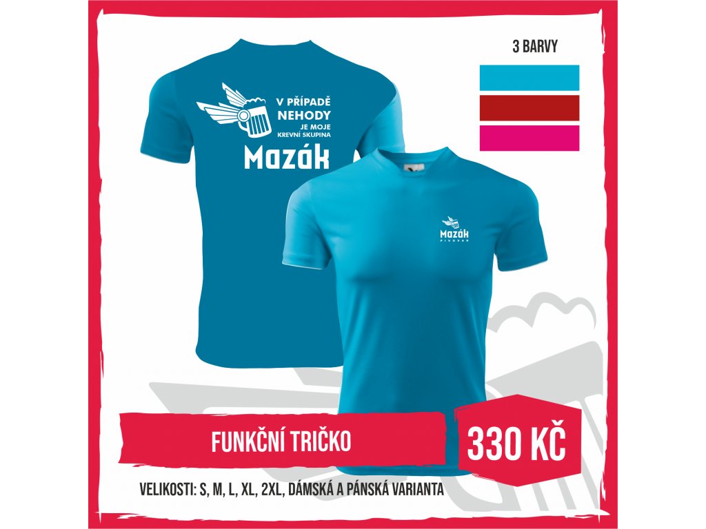 Trička pánská v modré a červené barvě. Tričko dámské v růžové barvě.