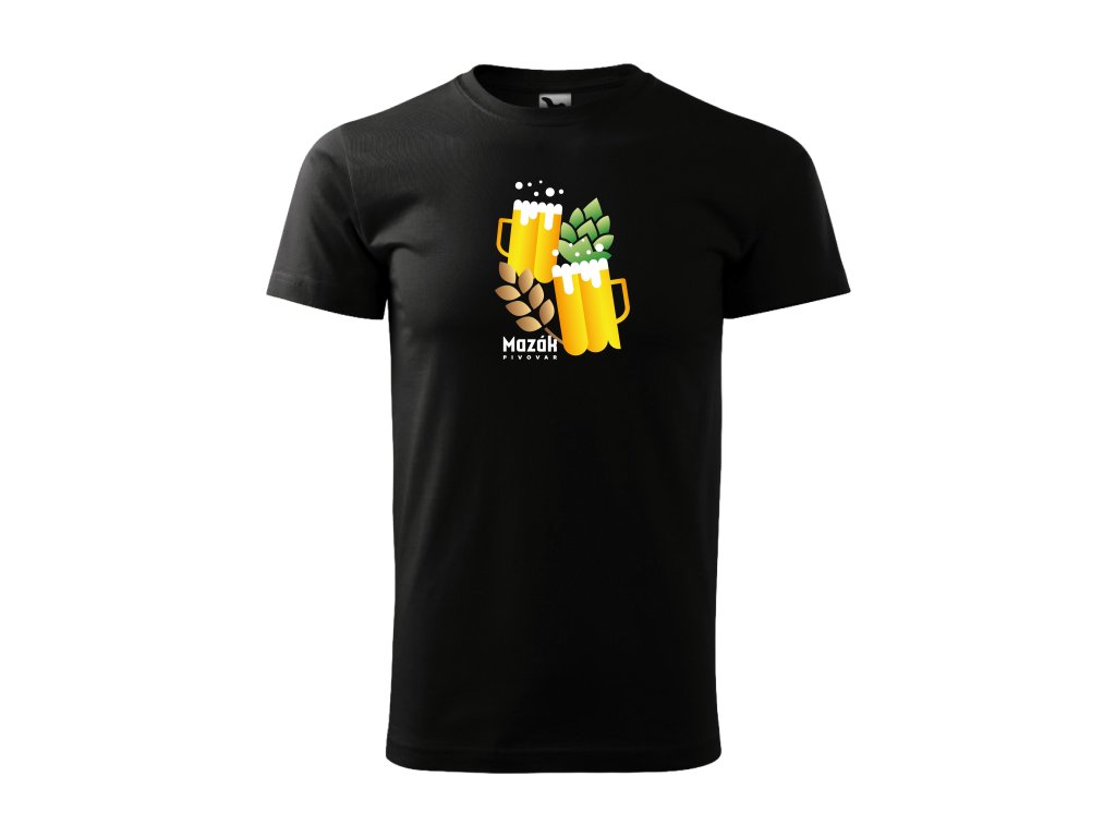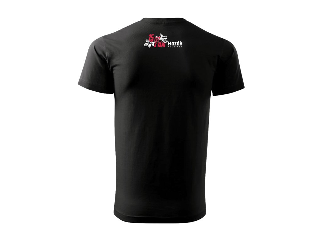 100% bavlna, gramáž 160g/m2. Vpředu obrázek krýgly s pivem Mazák, vzadu logo 15 let s Vámi.